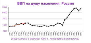 Главным сюрпризом ихработы стало выяснение того,что вплоть до1920-х российский ВВП надушу населения колебался около уровня конца XVII века. Итолько после окончания НЭПа быстро ипочти бесперебойно лез вверх вплоть доконца 1980-х.
