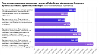 Наизбирательных участках зарубежом,согласно темже официальным данным,проголосовали почти 328 тысяч человек,изкоторых почти 272 тысячи— заСанду,56 тысяч— заСтояногло. Добрых 216 тысяч голосов разницы,без которых Санду (авместе сней ивоображаемый «европейский выбор») бысовершенно точно проиграла. Иеще важный факт: голоса заСанду нацелых 29%— это голоса диаспоры,аголоса заСтояногло на83%— это голоса жителей Молдовы.