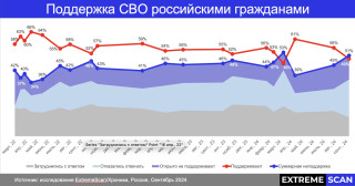 Согласно OpenMinds,исследующему содержание социальных сетей иСМИ,в течение уже первой недели после украинского вторжения вКурскую область настроения изменились сминус 0,25 доминус 0,47 пошкале,где минус 1— самое негативное отношение кСВО,а1— самое позитивное.
