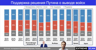 Вфеврале 2024 года поддержка войны внаших исследованиях упала с55-56% дорекордно низких 46%,аготовность вывести войска изУкраины,наоборот,рекордно поднялась— до49%.